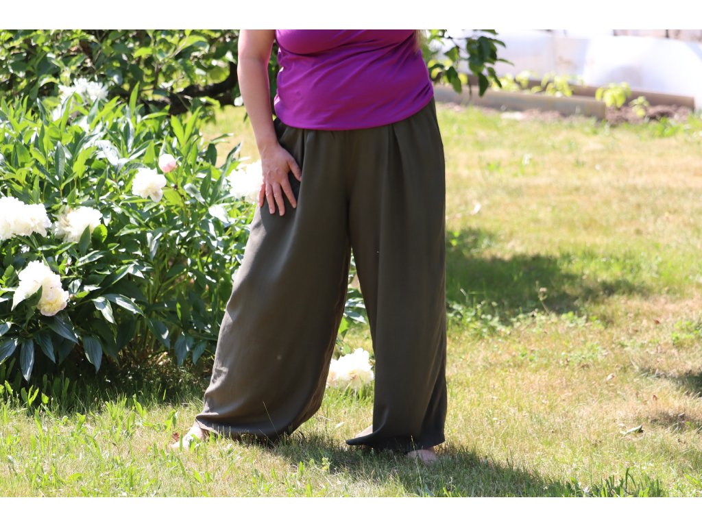 Vysoký pas jemně tvaruje siluetu a prodlužuje nohy, zatímco splývavý materiál vytváří dojem lehkosti a elegance bez námahy.